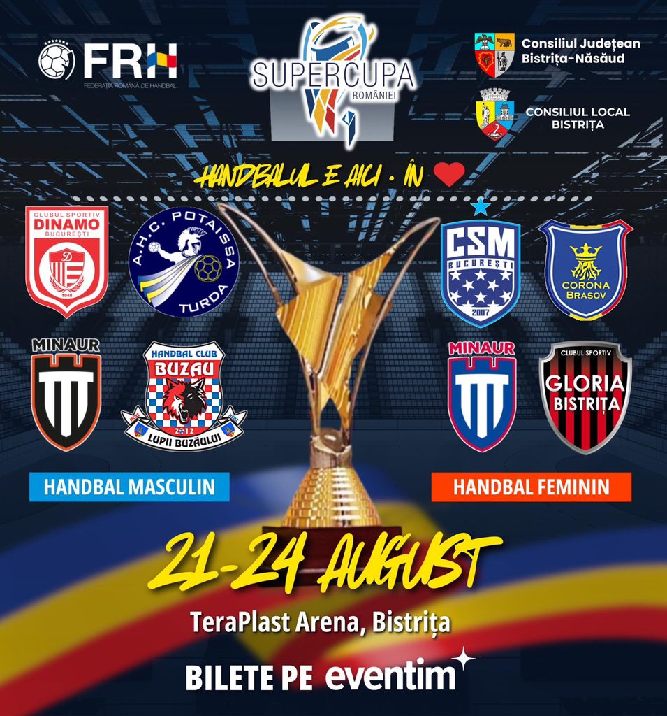 TeraPlast Arena din Bistrița găzduiește în perioada 21-24 august turneele Final Four ale Supercupei României la handbal masculin (joi-vineri) și feminin (sâmbătă-duminică).