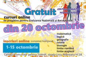 Până în 15 octombrie se pot face înscrieri la cursurile de pregătire pentru Evaluarea Națională și Bacalaureat, organizate la Centrul Comunitar pentru Tineret...