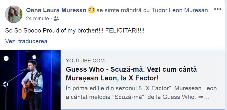 Tudor Leon Mureşan este fratele cântăreţei de jazz Oana Laura Mureşan care iată ce a scris pe Facebook imediat după apariţia fratelui ei în emisiune: