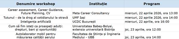 În cadrul evenimentului Târgul de Viitor, instituțiile vor susține mai multe workshop-uri, după cum urmează: