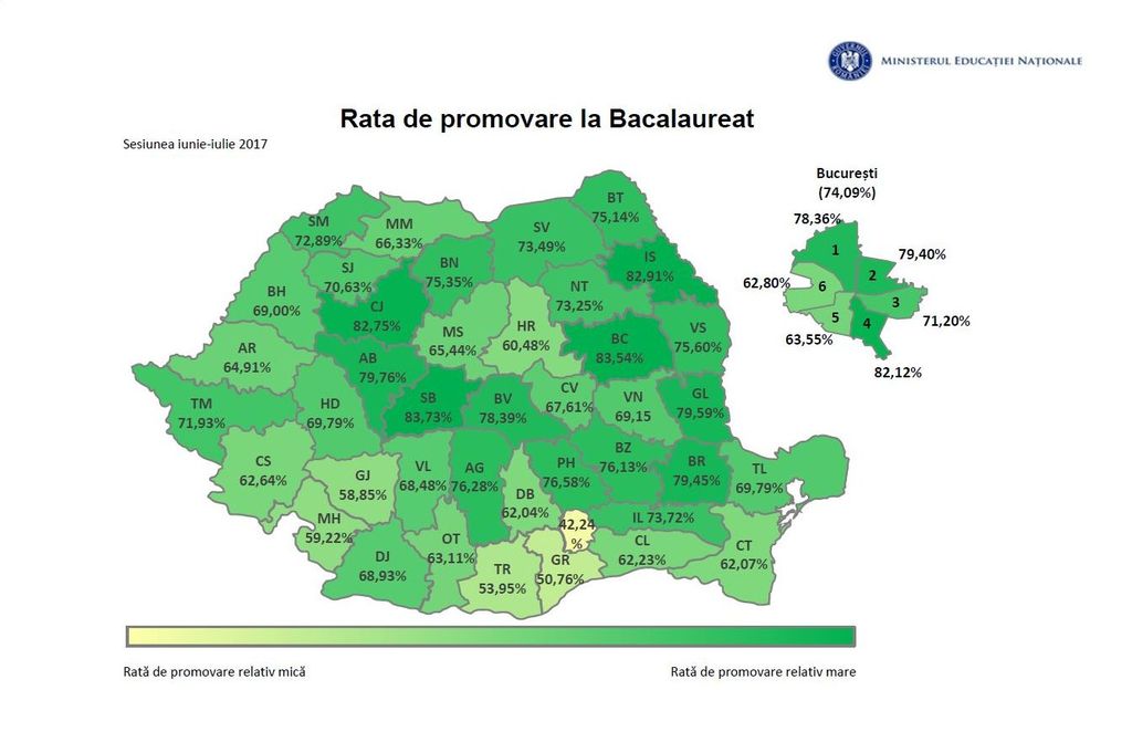 Media județeană de promovabilitate înainte de contestații este 75,35%, peste media națională de 71,4%. Anul trecut, rata de promovare la Bac în județ a fost de 69,9%.