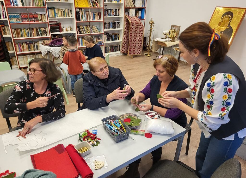 În timp ce trecea pe la mesele unde ieșeau minuni din mâinile femeilor, părintele nu îi scăpa din ochi pe adolescenți cu care lucrează intens în această perioadă să pregătească o piesă de teatru care va fi prezentată, la Târgul de Crăciun din 21 decembrie, ora 15.00, unde vor fi vândute toate ornamentele la care se lucrează la șezătorile de la Arcalia.