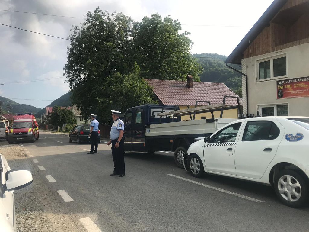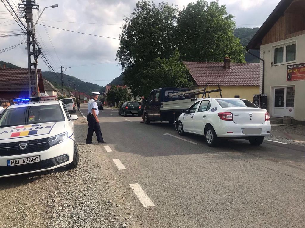Autoutilitară a fost proiectată în alt autoturism care era condus de un tânăr de 18 ani din Telciu și care era oprit pentru a se asigura la efectuarea virajului spre stânga, arată măsurătorile efectuate de polițiști la fața locului.
