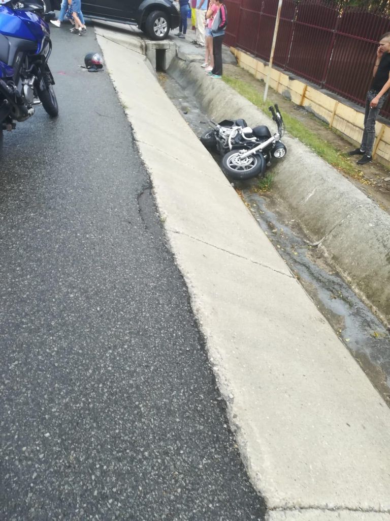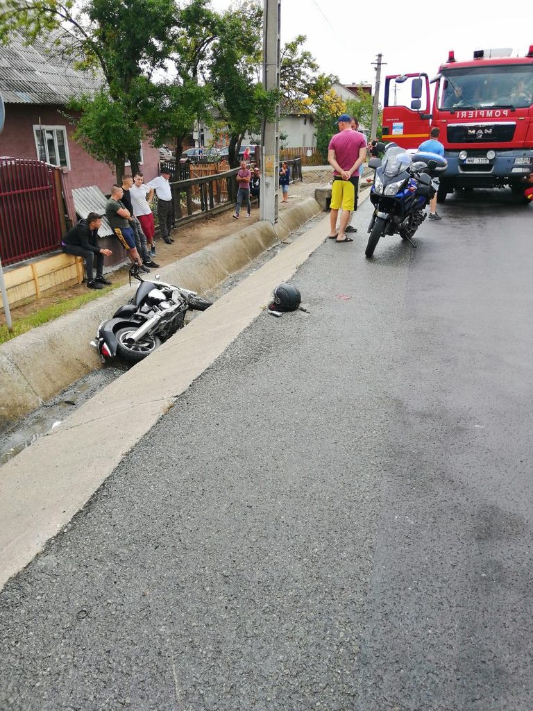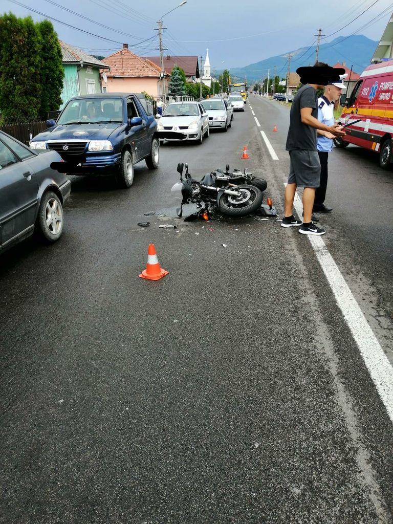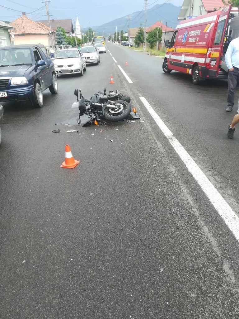 Un alt accident (foto jos) a avut loc la Tiha Bârgăului. În el au fost implicați doi motocicliști și un șofer.