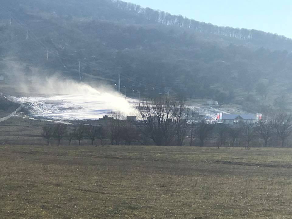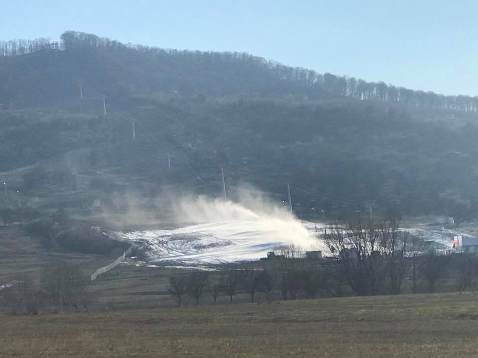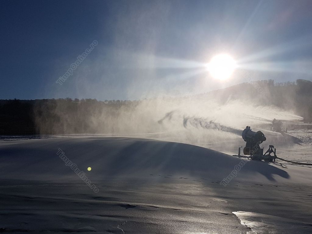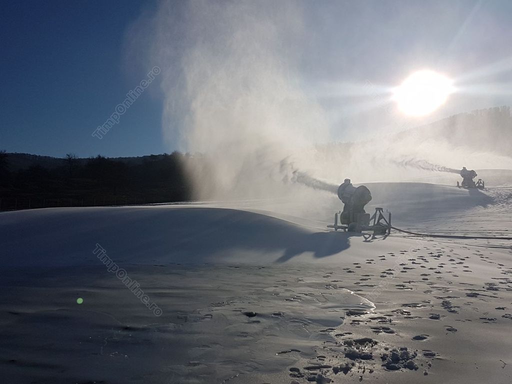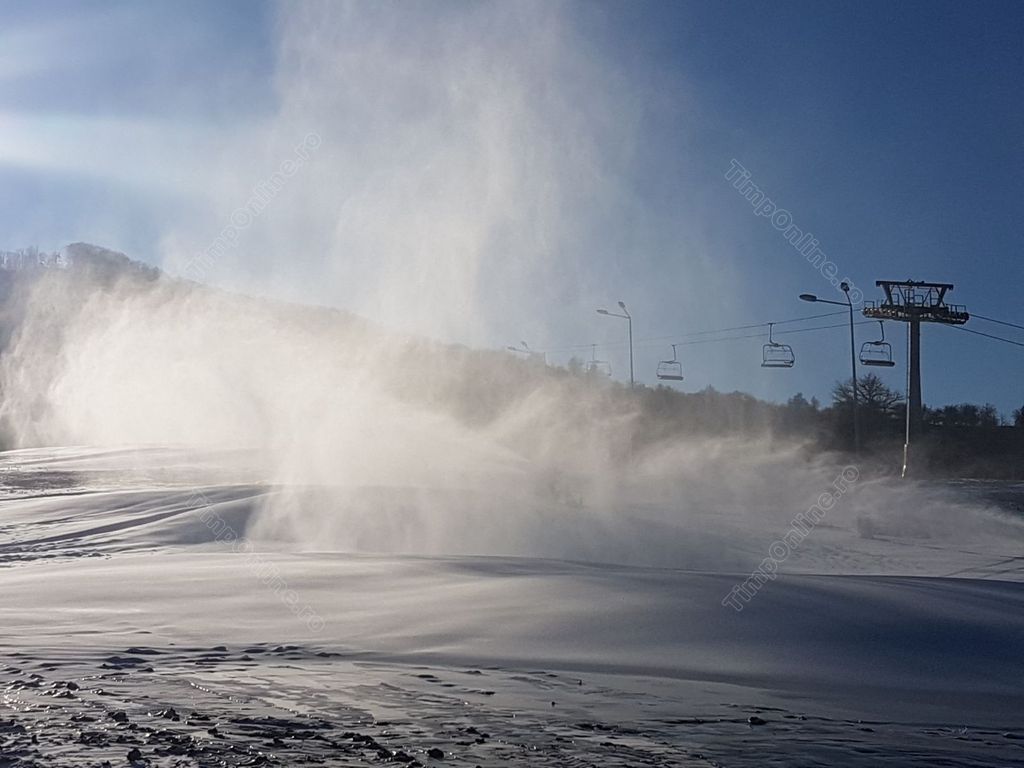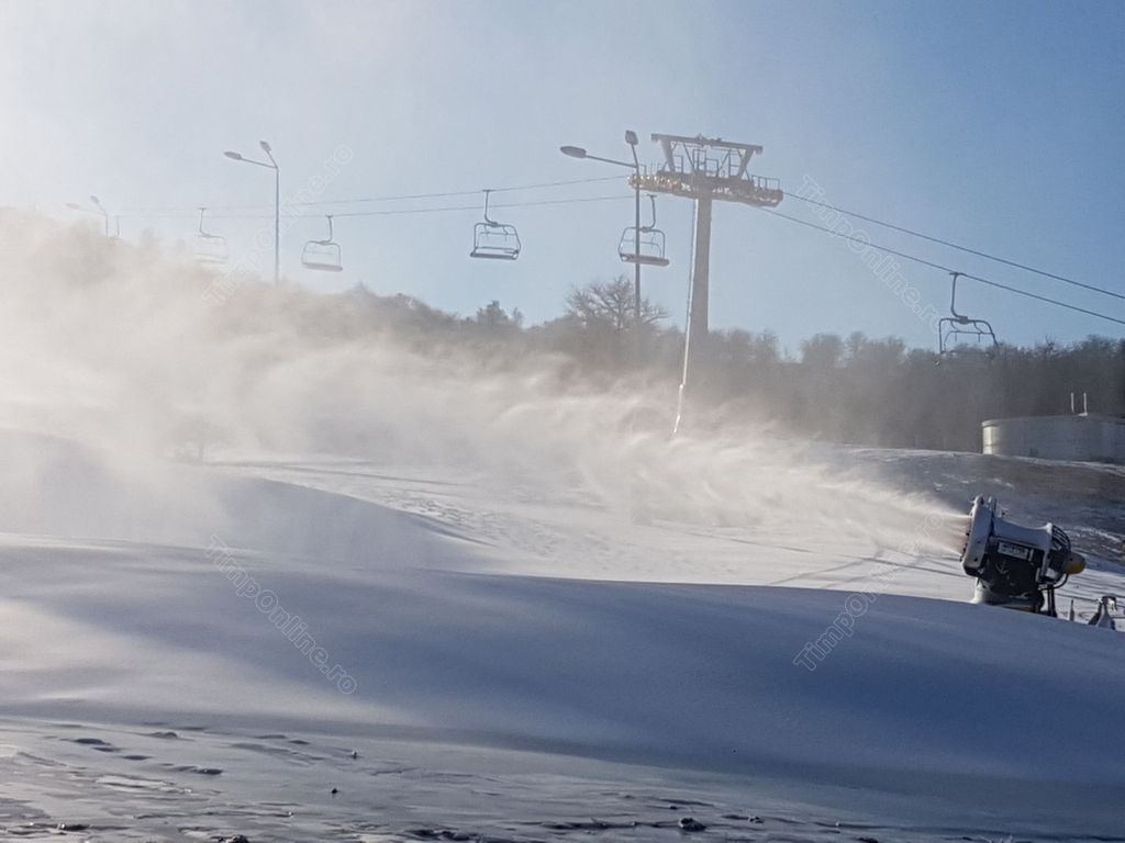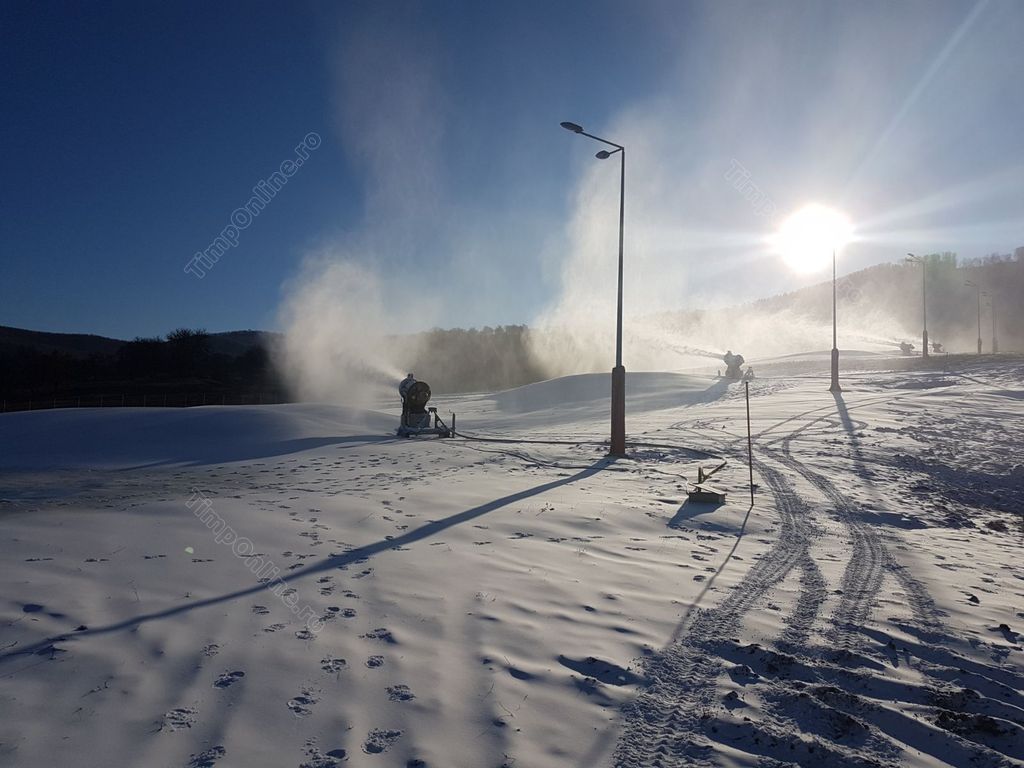 La finalul anului trecut, primarul Ovidiu Crețu spunea: ”Trebuie să avem temperaturi de minus 5 grade, cel puțin noaptea, și în momentul în care vom avea astfel de temperaturi dăm drumul la tunurile pentru zăpadă artificială pe pârtia de schi. Este și un test, să vedem cum funcționează toate sistemele împreună. Pârtia este omologată, așteptăm practic frigul și, desigur, așteptăm și zăpadă naturală pentru că după ultimele calcule ar fi fost nevoie să mai achiziționăm, cel puțin pe zona ocolitoare, încă niște lăncii pe ceea ce am suplimentat acum pentru zăpadă, dar o să ne descurcăm iarna asta fără iar la anul vom rezolva și această problemă. Ca să deschidem pârtia pe zăpadă artificială trebuie să avem o săptămână cu temperaturi negative iar noaptea să fie măcar minus 5 grade ca să putem produce zăpadă. Sigur că putem produce zăpadă și ziua, dar în general în perioadele cu frig ziua mai ajunge temperatura la minus 1 – minus 2, iar noaptea – la minus 7, minus 10 și atunci tunurile sunt foarte eficiente, cantitatea de zăpadă produsă dintr-un litru de apă este mult mai mare dacă turnurile lucrează la temperaturi sub minus 5 grade”.