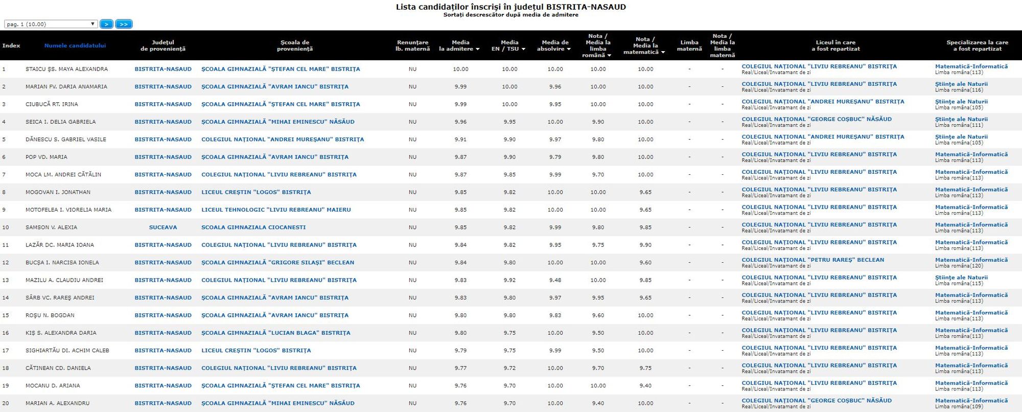 Aici lista candidaților înscriși în Bistrița-Năsăud, sortați descrescător după media de admitere.