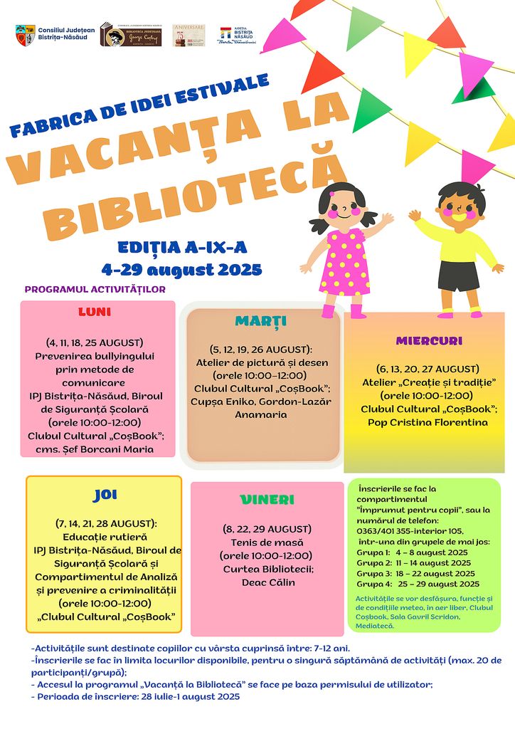 Biblioteca Județeană ”George Coșbuc” Bistrița-Năsăud organizează, în perioada 4-29 august, cea de-a IX-a ediție a ”Fabricii de Idei Estivale – Vacanța la Bibliotecă”. Perioada de înscriere: 28 iulie – 1 august.