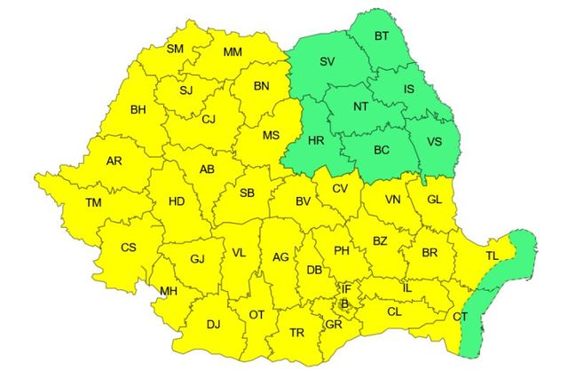 În cea mai mare parte a Transilvaniei și local în centrul Moldovei vor fi perioade cu instabilitate atmosferică ce se va manifesta prin averse torențiale, descărcări electrice, intensificări ale vântului (rafale de 50…55 km/h) și izolat grindină de mici dimensiuni (1-2 cm). În intervale scurte de timp sau prin acumulare, cantitățile de apă vor fi de 20…25 l/mp și izolat de peste 35…40 l/mp.