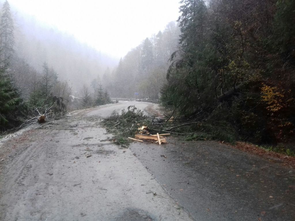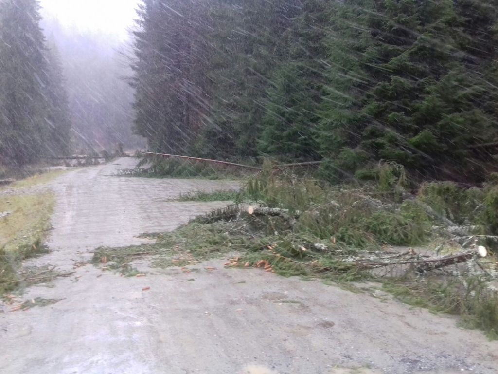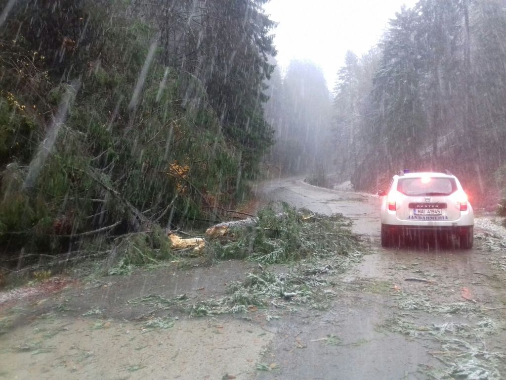 Jandarmii montani Rodna se afla în patrulare. La 2 km de Valea Mare, spre Pasul Rotunda și Valea Măriilor, din cauza vântului puternic mai mulți brazi au fost rupți și au căzut pe drum, îngreunând accesul autovehiculelor. Momentan este lapoviță. În Pasul Tihuța ninge viscolit la 1.200 m, informează Inspectoratul de Jandarmi Județean.