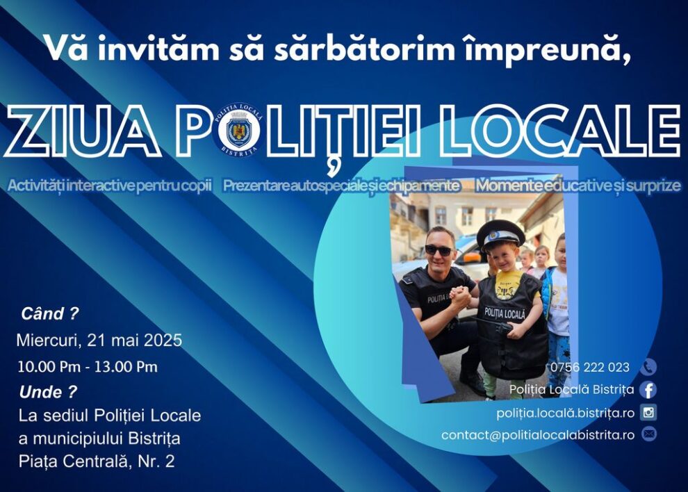 Ziua Poliției Locale va fi sărbătorită la Bistrița miercuri 21 mai, când vor avea loc prezentări de autospeciale și echipamente, activități interactive pentru copii, momente educative și surprize.